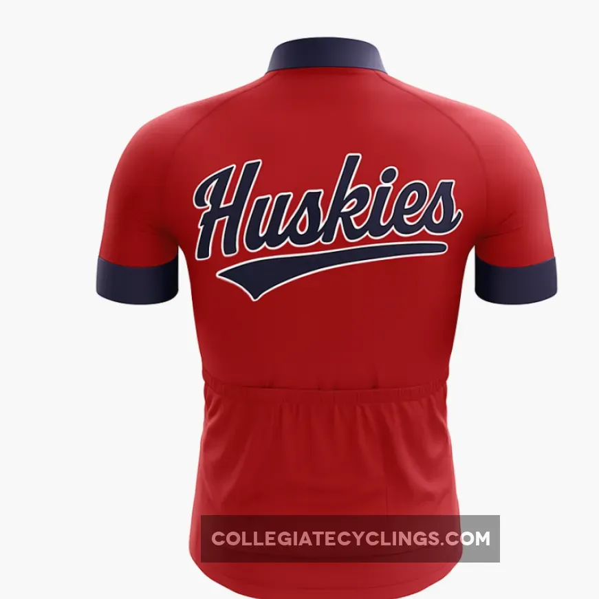 Howl with team spirit in this Huskies cycling jersey, boasting bold navy Huskies script on a vivid red base with navy collar trim for a classic athletic edge. Lightweight and aerodynamic, this bike top suits road cycling, snowy trail spins, and fan group rides—perfect for UConn supporters or dog lovers bringing husky power and university loyalty to their high-performance cycling kit.